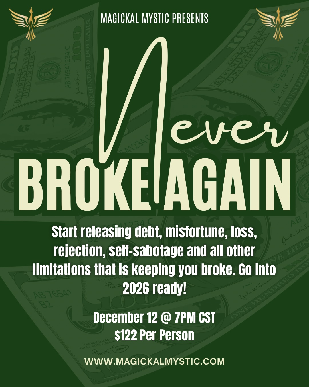 $122.00Release debt, bad luck, sickness, loss, rejection, self-sabotage, laziness, procrastination, and anything else that has kept you broke or broken. WHEN- 12/12 AT 7PM CST/8PM EASTERN Products Aligned to the Ritual- MM- Creator’s Delight, Manifestation, Full Harvest, Accumulation, Pot of Gold, Divine Surplus, Release, Get Over It, Fulfillment, Dominate, Expansive, Lux of Lakshmi, Grace of Yemaya, Treasures of Vasudhara, Debt Cancellation TA- Prosperity, Infinite Wealth, Money Manifestation, I Am Money, I Am Profitable, For the Love of Money, Opulence